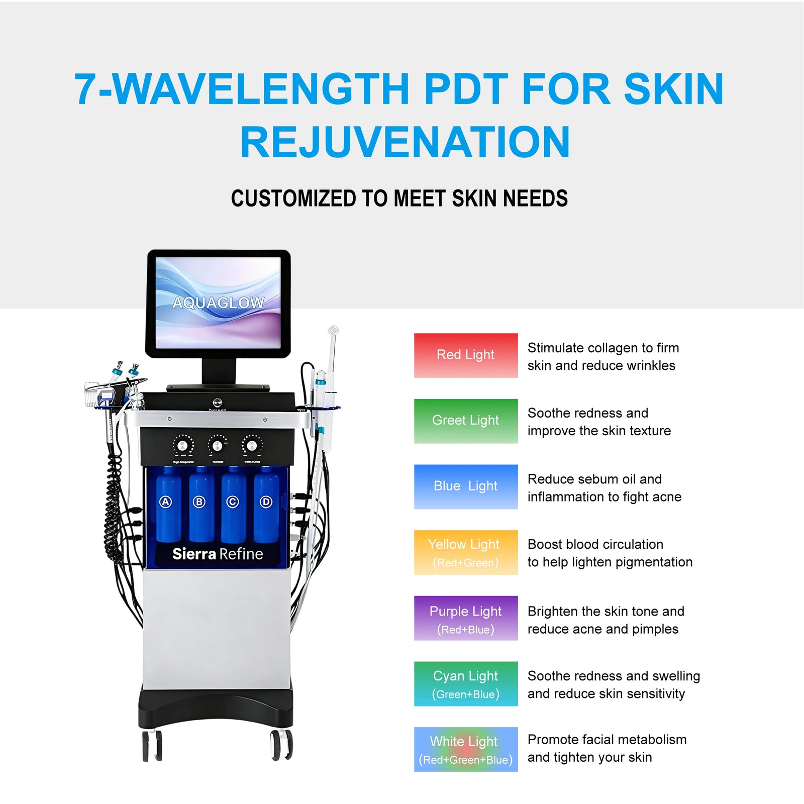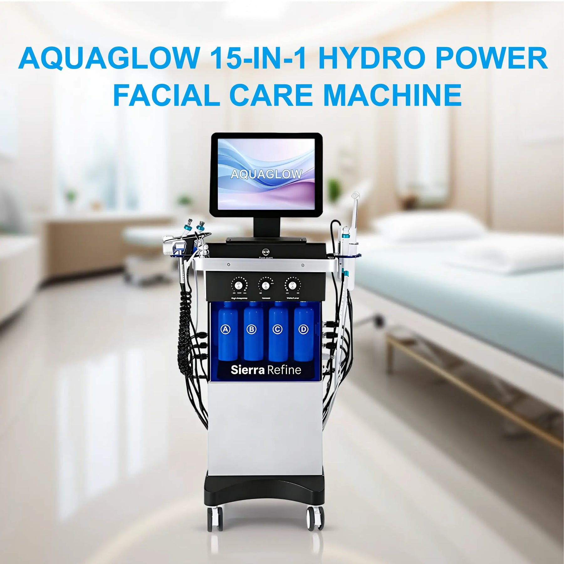 Sierra Refine offers a versatile line of professional hydro facial machines. The AquaGlow 15-in-1 machine stands out in a market flooded with multifunctional skincare devices. It integrates 15 professional-grade treatments into one system. The device is advanced yet simple to operate with a 14-inch HD touchscreen. The system delivers measurable results: hydration, pore reduction, and fine-line smoothing within 4–6 weeks, with non-invasive treatments requiring no downtime.