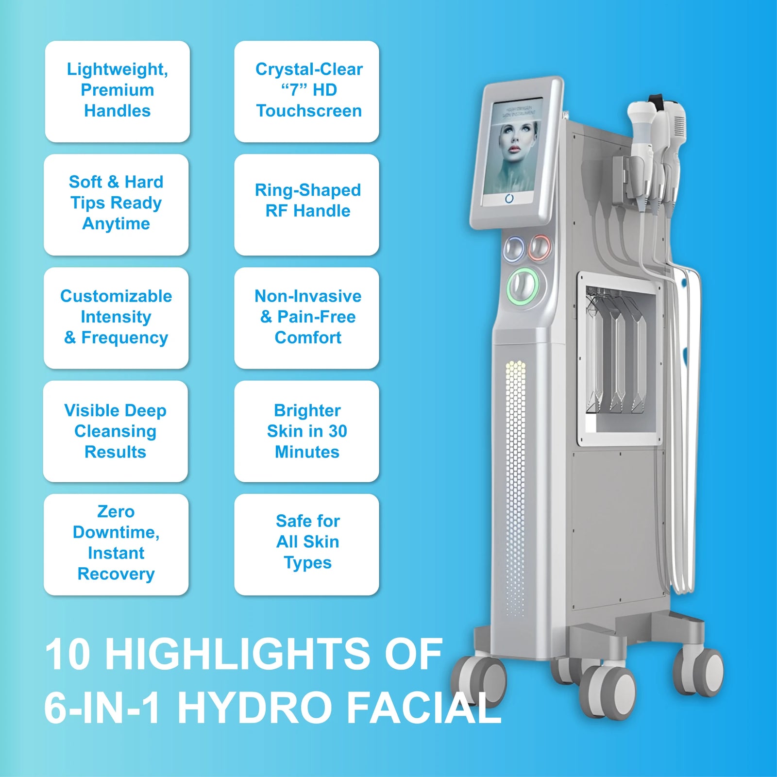 This Aquordis 6-in-1 hydro facial features a 7-inch HD touch screen with an intuitive interface. It’s simple to adjust settings and handle parameters.