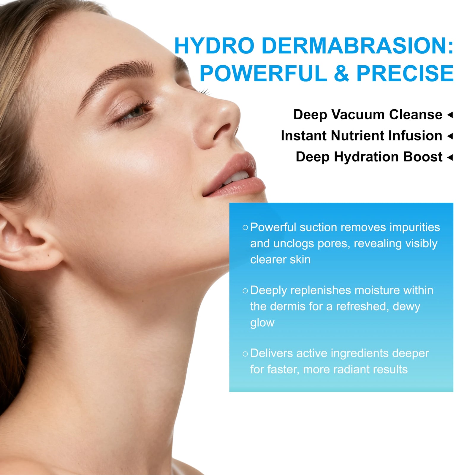 Hydro dermabrasion helps to vacuum away stubborn keratin buildup and dead skin cells. It then instantly floods your pores with nourishing serums and oxygen. One step cleanses pores and hydrates skin, helping products absorb faster.