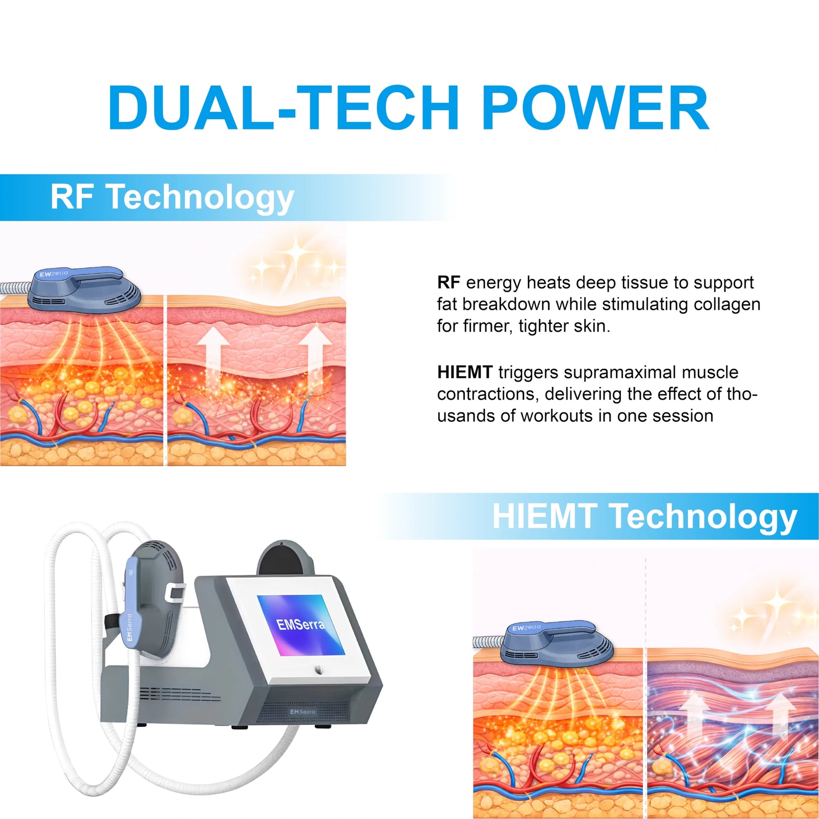 - HIEMT Technology: HIEMT uses focused electromagnetic waves to stimulate supramaximal muscle contraction. A 30-minute session equals thousands of high-intensity workouts. This boosts the number and size of muscle fibers, supporting muscle growth.