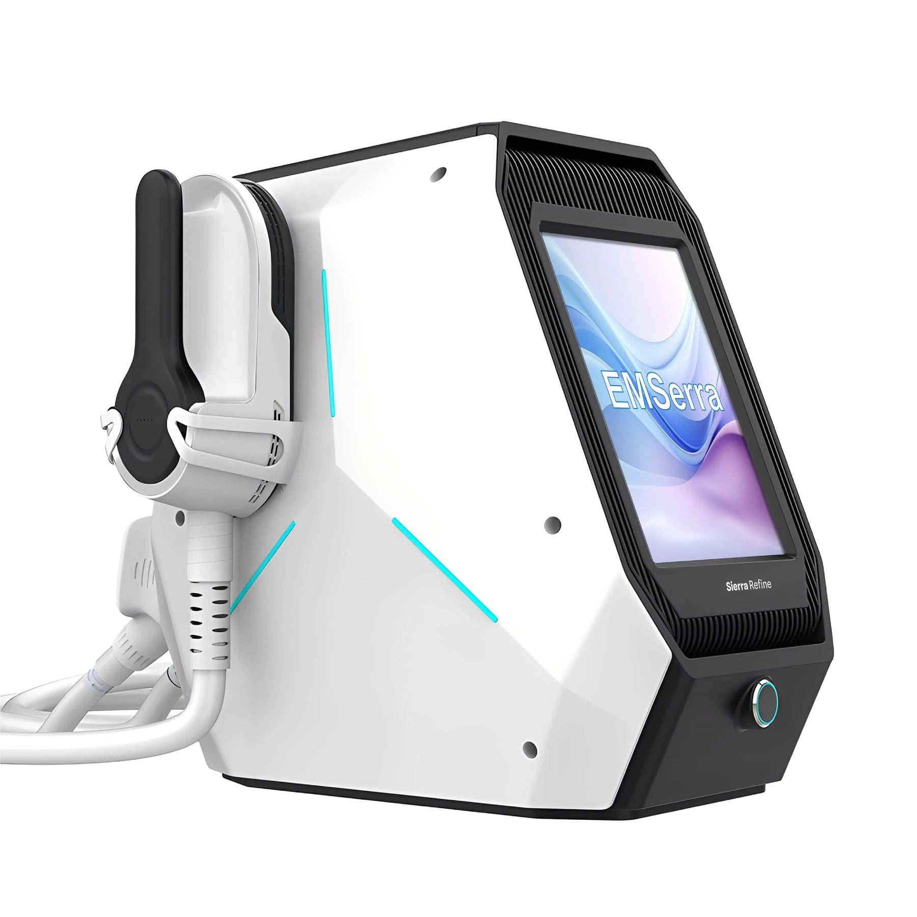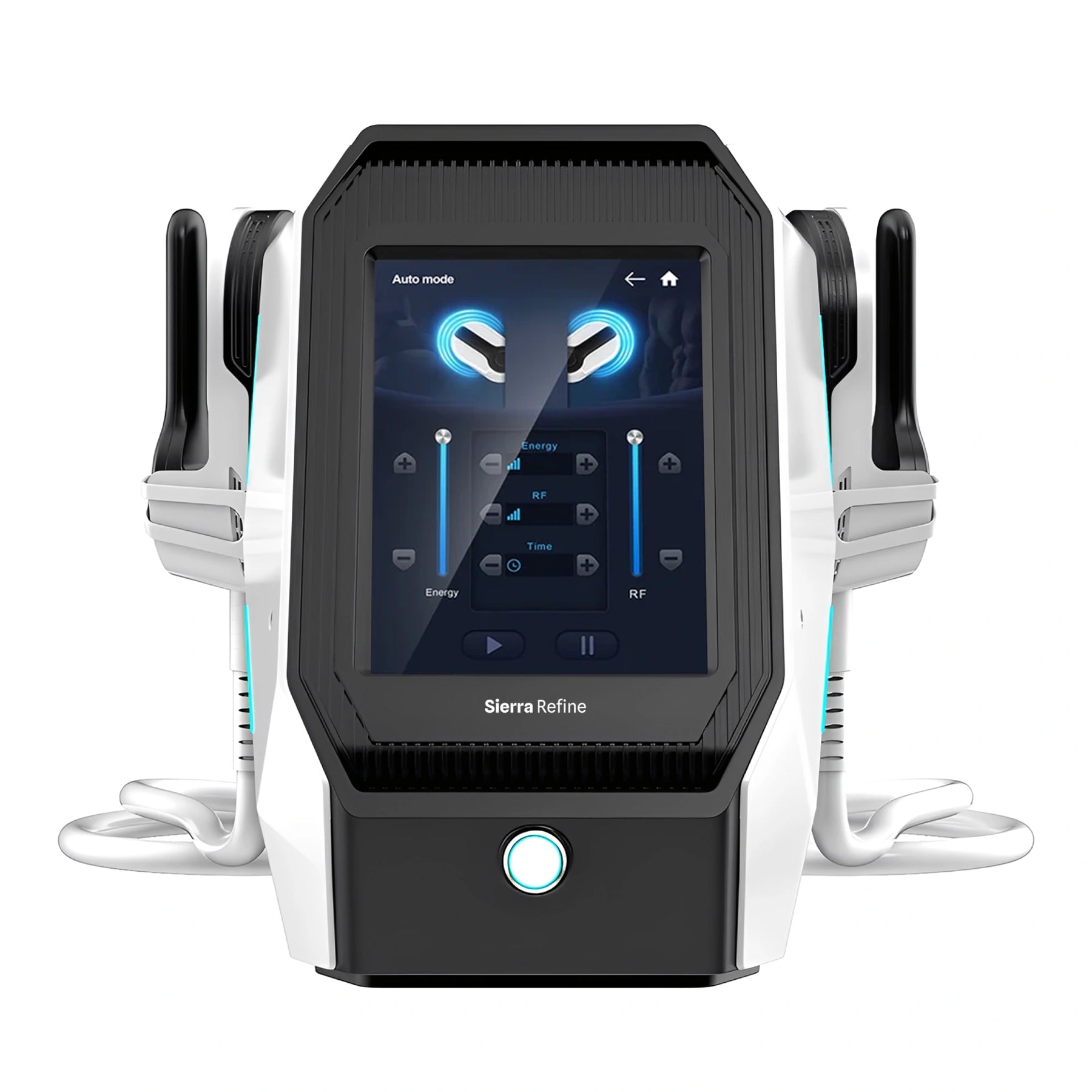 Dual HIEMT + RF handles allow simultaneous multi-area treatment. Adjustable intensity per mode delivers tailored protocols and client comfort.
