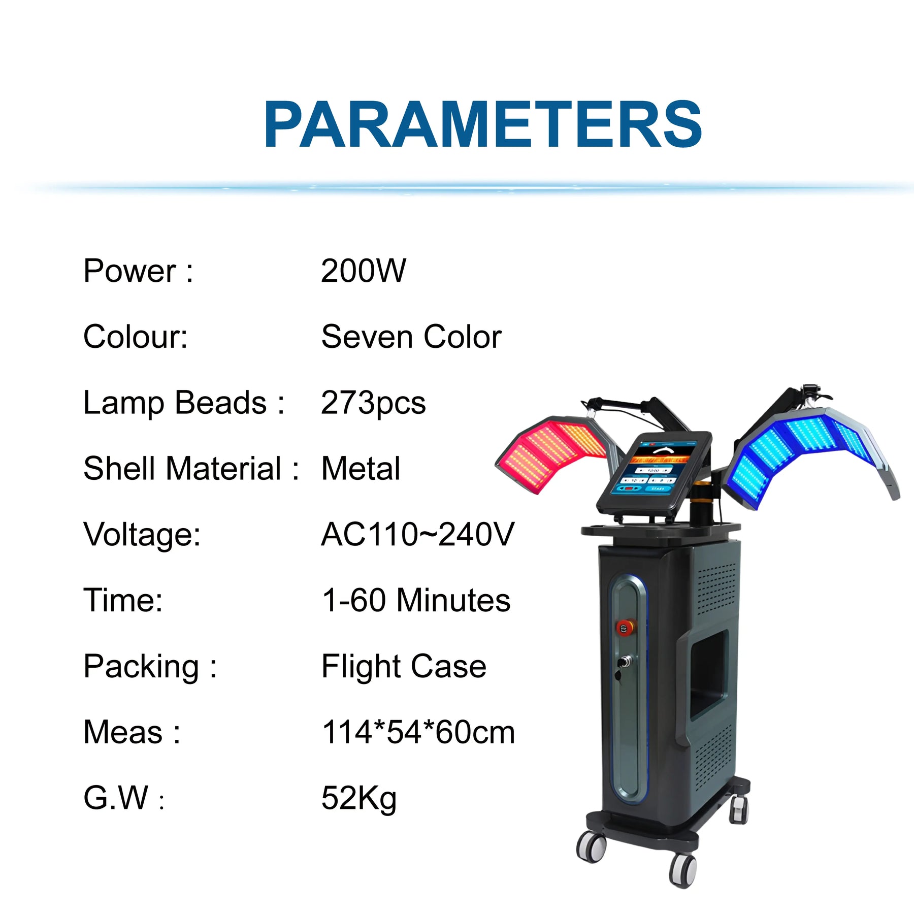Instrument Description: The PDT and LED machine delivers seven different colors of light to treat various skin conditions, providing a non-invasive method to enhance skin health and appearance. It is designed to target multiple layers of the skin, offering therapeutic benefits such as rejuvenation, acne treatment, and skin tightening.